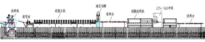 一、涵洞波紋板設備圖片整條生產線由放料/引料系統、成型系統、自動輸送/定位系統、沖孔系統、自動收料系統、打彎弧系統、電控系統等部分組成。